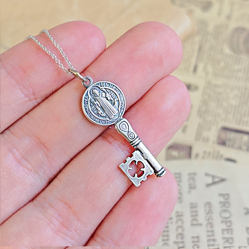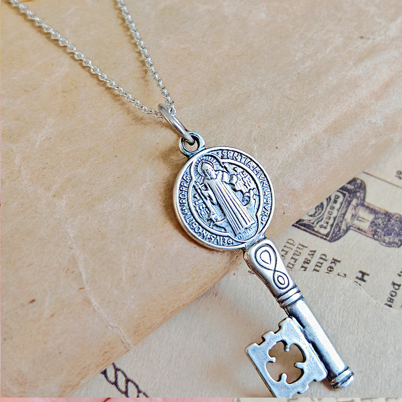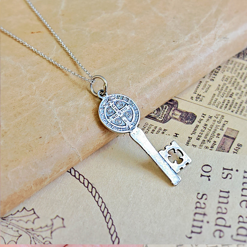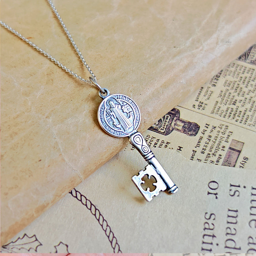 Este colgante en forma de llave, forjado en Plata de Ley 925, incorpora la Medalla de San Benito, uno de los símbolos más antiguos y poderosos de protección espiritual en la tradición cristiana y esotérica.