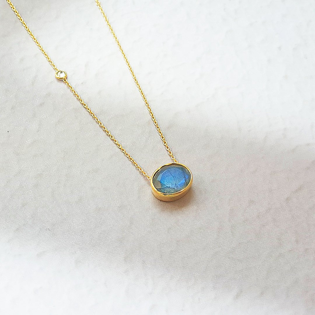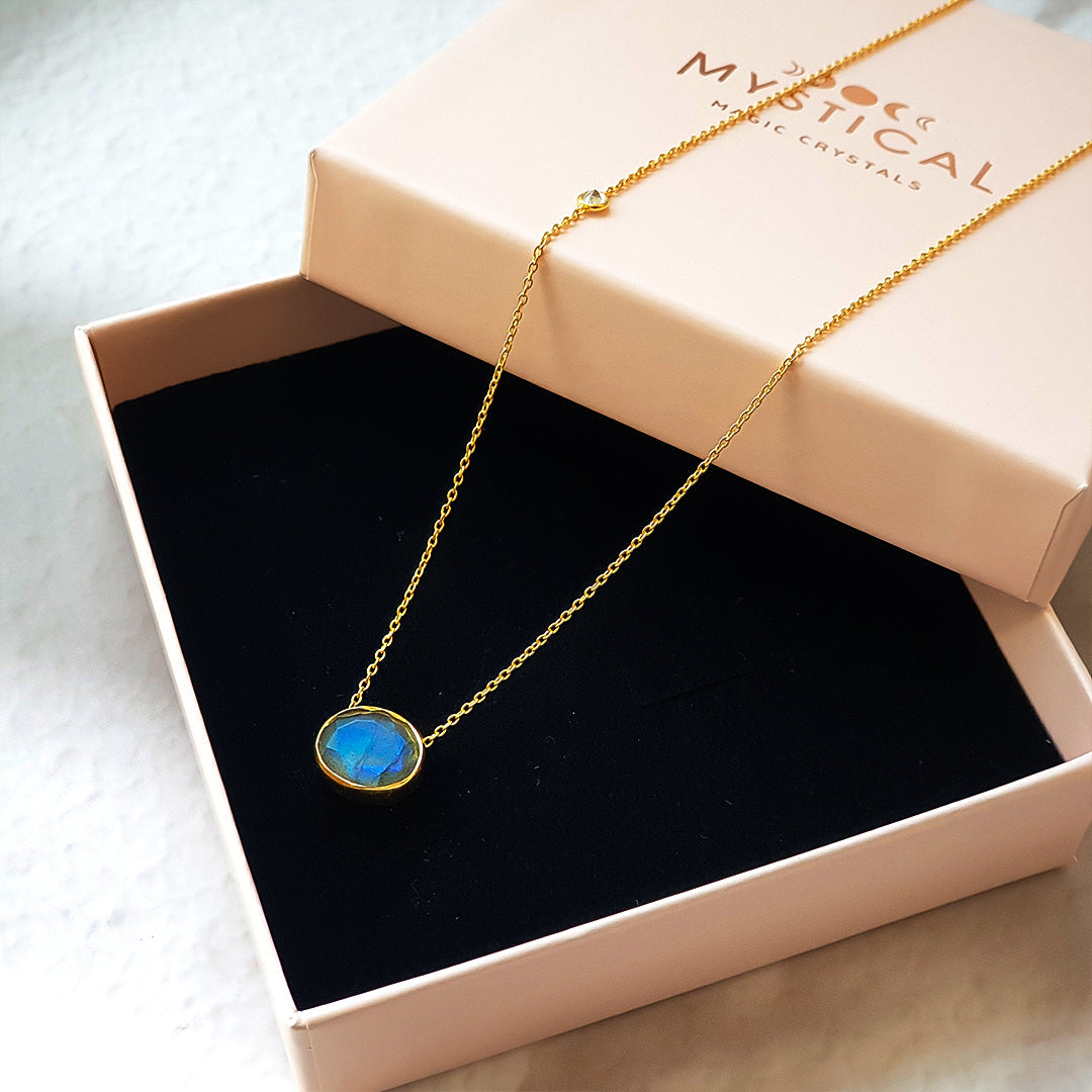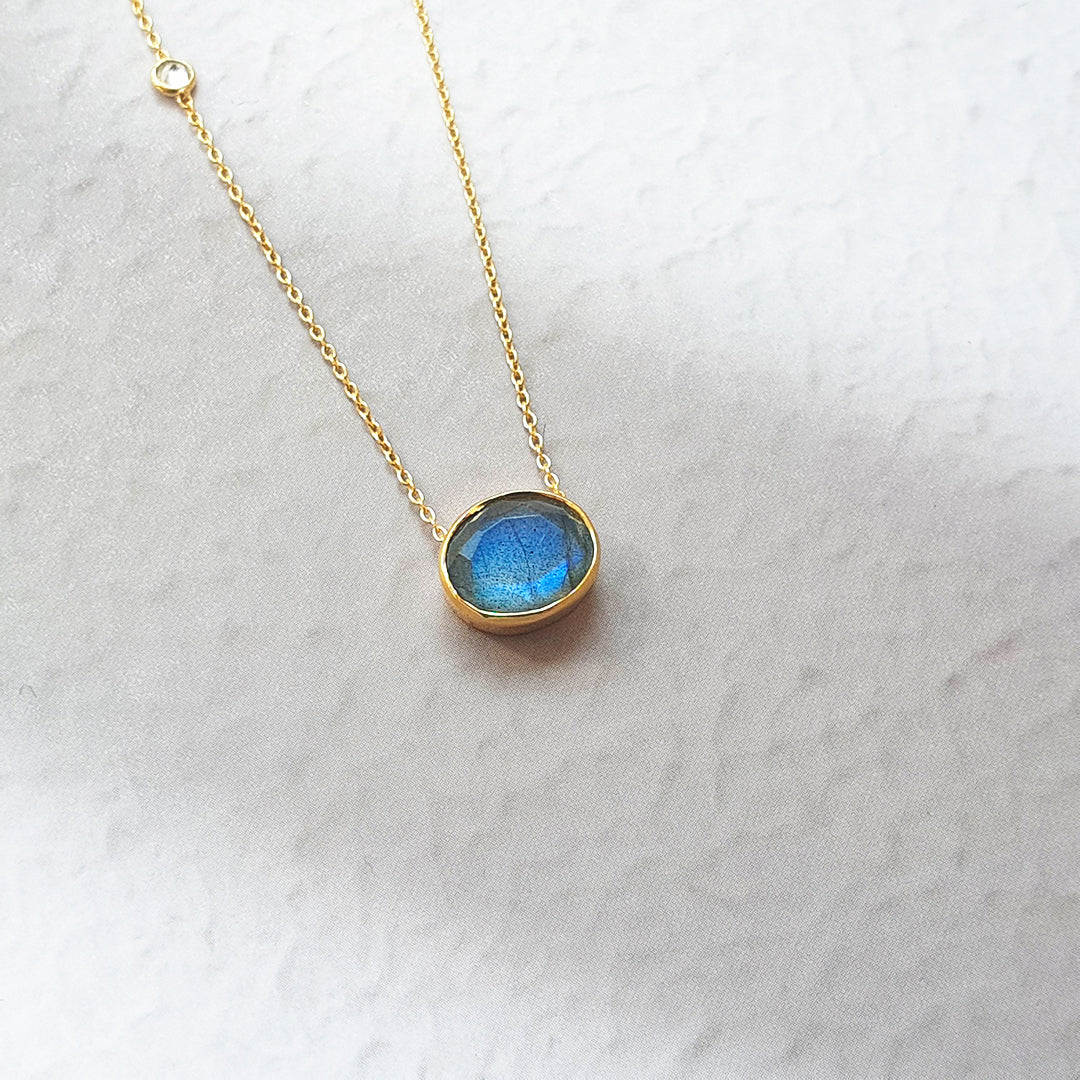 La Labradorita es una gema que tiene un efecto óptico conocido como labradorescencia, que hace que la luz se refleje en su superficie otorgándole unos preciosos reflejos tornasolados, verdes, azulados y plateados.