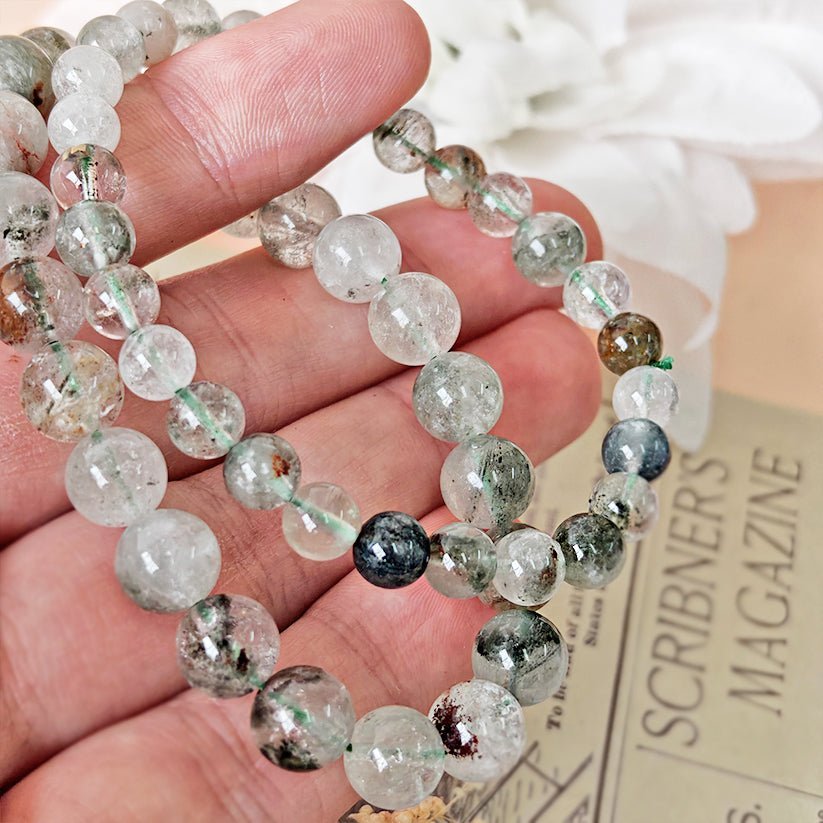 Se trata de un Cuarzo Maestro que nos vincula con la Naturaleza y que está formado por Cristal de Roca en cuyo interior hay múltiples minerales atrapados: la Clorita, la Fluorita, el Rutilo, el Hematites…. creando unas formas y unas luces únicas en su interior. También es conocido como el Cuarzo Bosque Mágico o Cuarzo Jardín debido a que su aspecto recuerda a un cristal que encierra dentro un paisaje natural semejante a un bosqueo un paisaje marino.